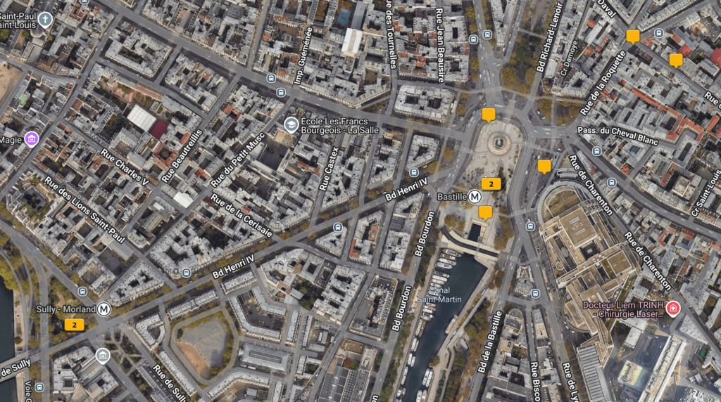 La Bastille byggdes ursprungligen som ett försvarsverk vid en av de gamla stadsmurarna men blev med tiden ett fruktat och hatat fängelsefort. När parisarna började riva Bastiljen med de verktyg de kunde komma över, räknas som startskottet för franska revolutionen. När Bastiljen revs användes stenen för att bygga Pont de la Concorde, bl.a. När man grävde för Metro Bastille hittades några grundstenar från Bastiljen. De finns numera till beskådande i utkanten av den lilla parken vid Pont de Sullys brofäste på högra stranden.