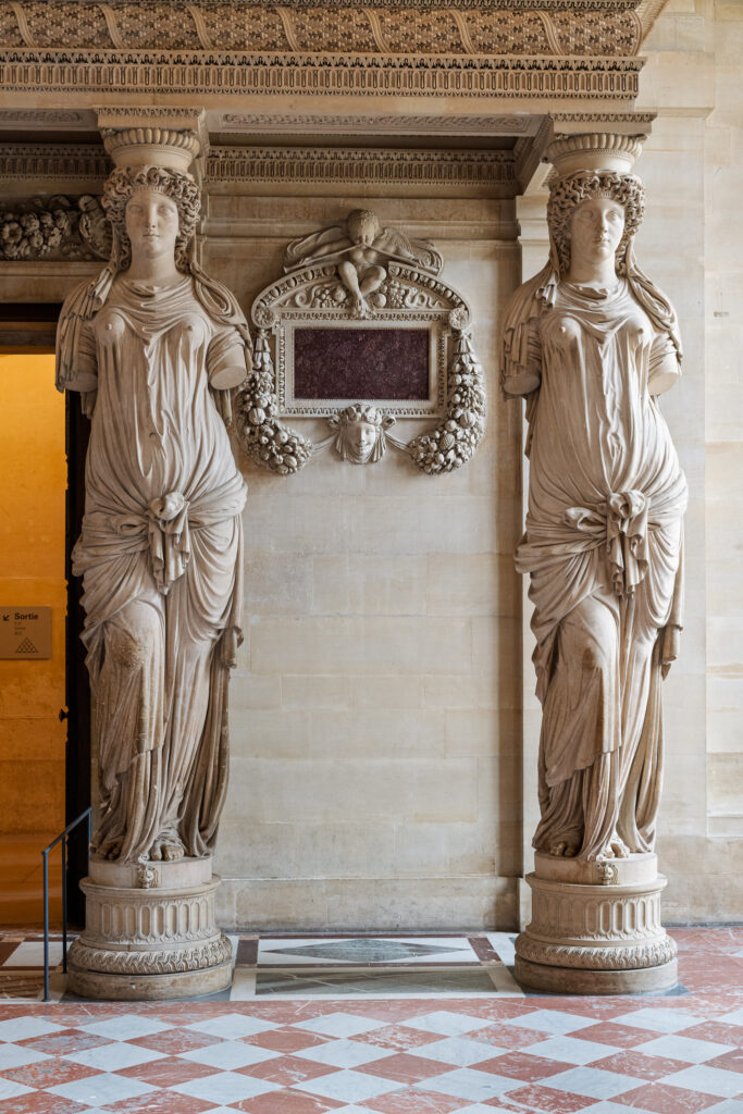 Om vi nu begränsar oss till Paris, finns mina favoriter i Louvrens Salle des Caryatides, Henri II:s gamla festlokal som numera hyser antik skulptur. François I hann före sin död ge sin arkitekt Pierre Lescot uppdraget att förvandla Louvren 1.1 till ett modernt renässanspalats. (Kungen hade redan 20 år tidigare beordrat rivningen av det gamla försvarstornet.) Lescot grep sig an verket. Efter François död, fortsatte arbetet under Henri II. Den västra flygeln revs och gav plats åt den vänstra delen av det som idag går under namnet Lescot-flygeln. Det är här vi hittar Karyatidsalen. Även den södra flygeln mot Seine revs och ersattes av modernare arkitektur i denna ombyggnad. Louvren 2.0 var född.