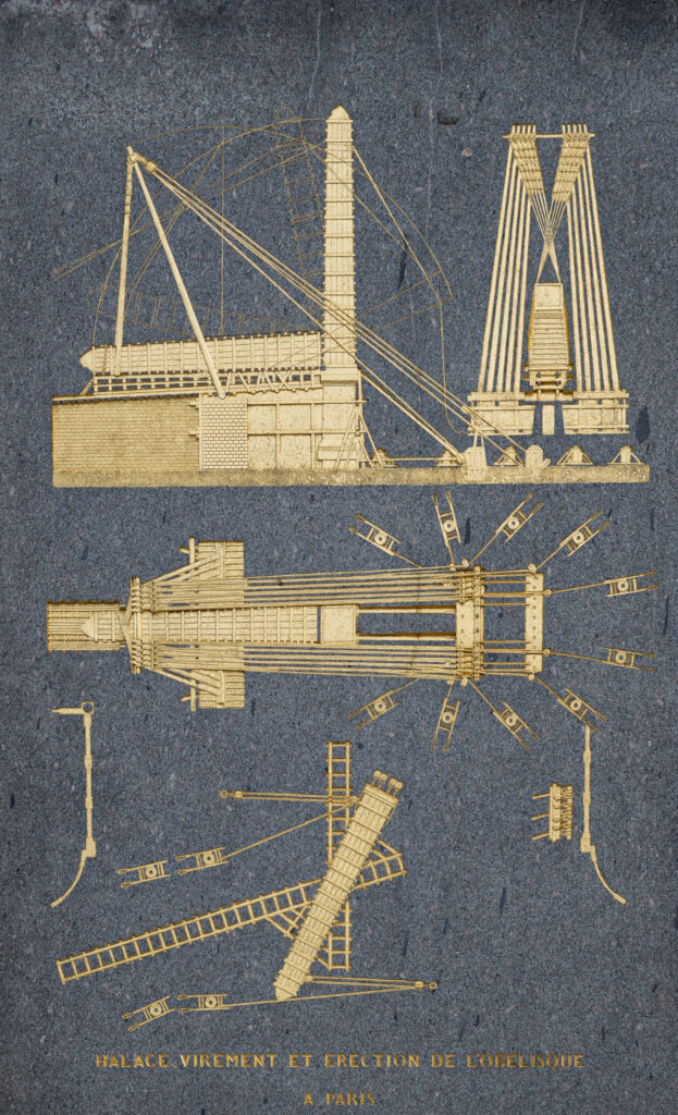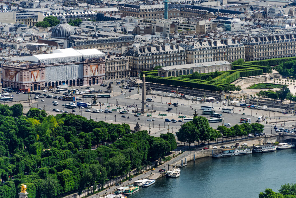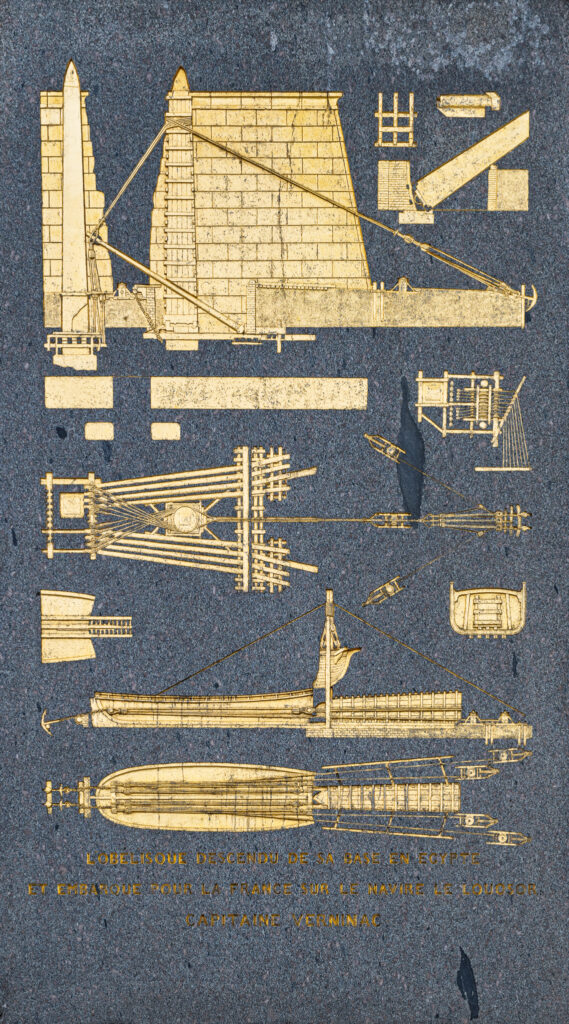 Obelisken är kanske det som först drar blickarna till sig. Runt obeliskens sockel finns förgyllda reliefer som beskriver hur obelisken monterades ner i Luxor, transporterades och slutligen restes på torget. Obelisken var en gåva från Egypten, egentligen var det två obelisker som skänktes, men det var tillräckligt besvärligt att hantera endast en, så den andra står kvar vid sitt tempel i Luxor.