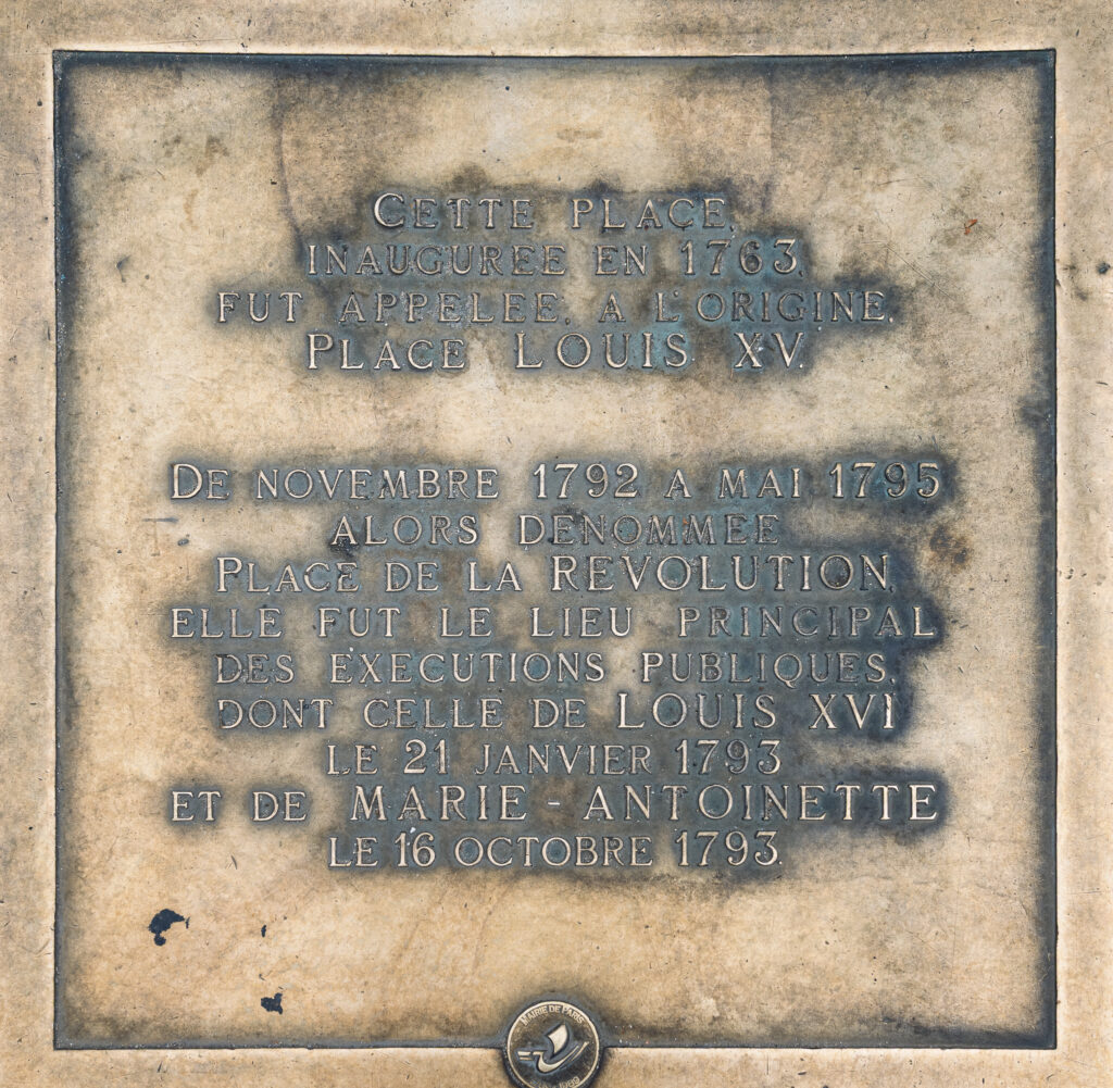 Straxt väster om obelisken finns, infattat i gatläggningen, en minnestavla över Louis XVI och Marie Antoinette. De giljotinerades på Place de la Révolution. Giljotinen flyttades runt i Paris några gånger under revolutionsåren, men lär då den nackade de kungliga ha varit placerad ungefär där några människor syns passera övergångsstället på en av bilderna. (Jag har inte fått detta definitivt bekräftat, så det får stå som ett tillsvidarefakta.)