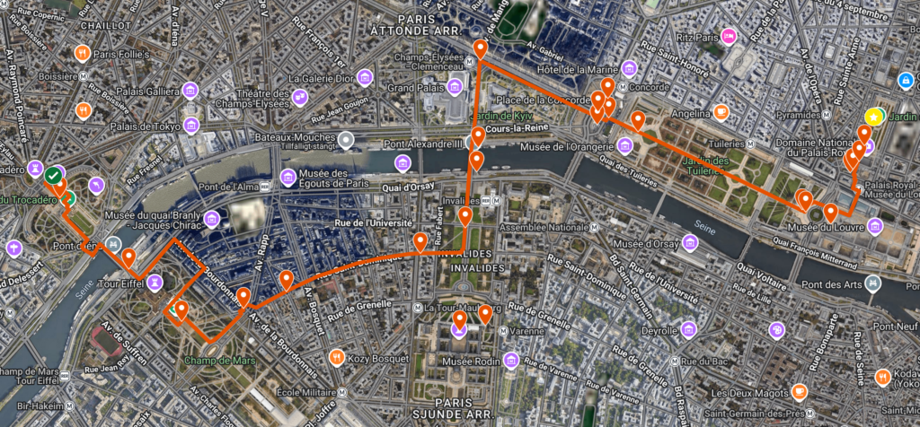 Vad du får se: Eiffeltornet, Champ de Mars, Rue Saint-Dominique, Les Invalides, Pont Alexandre III, Grand Palais, Petit Palais, Avenue des Champs-Élysées, Place de la Concorde, Jardin des Tuileries, Louvren, Palais Royal