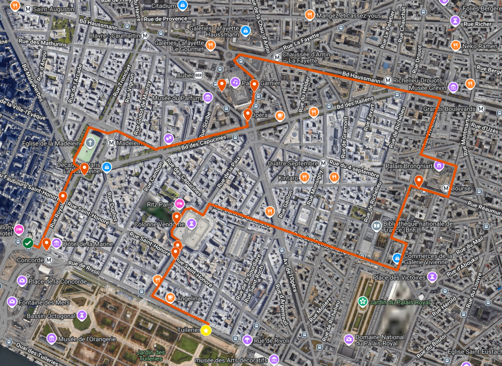 Vad du får se: Place de la Concorde, Église de la Madeleine, L’Opéra Garnier, Boulevard Haussmann, Bourse (Palais Brongniart), Galerie Vivienne, Place Vendôme, arkader längs Rue de Castiglione och Rue de Rivoli.