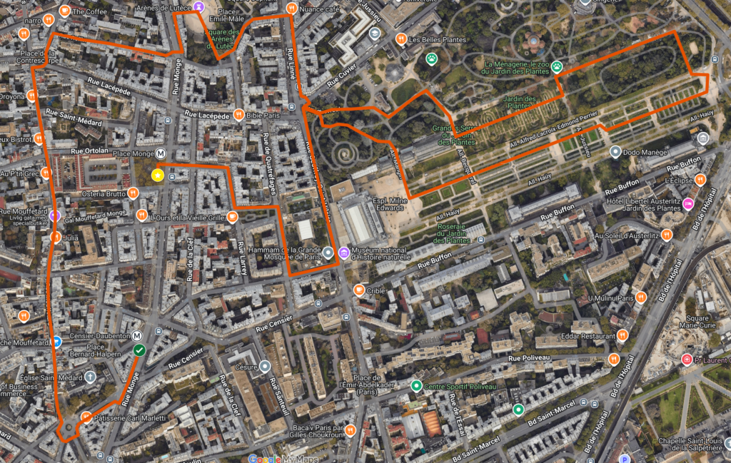Distansen kommer att bero på hur du rör dig i Jardin des Plantes. Med det inlagda spåret (som inte ska ses som en rekommendation, bara som ett exempel på distansen) blir det totala sträckan 3,8 km. Väljer du att hoppa över Jardin des Plantes blir det just 2,2 km.