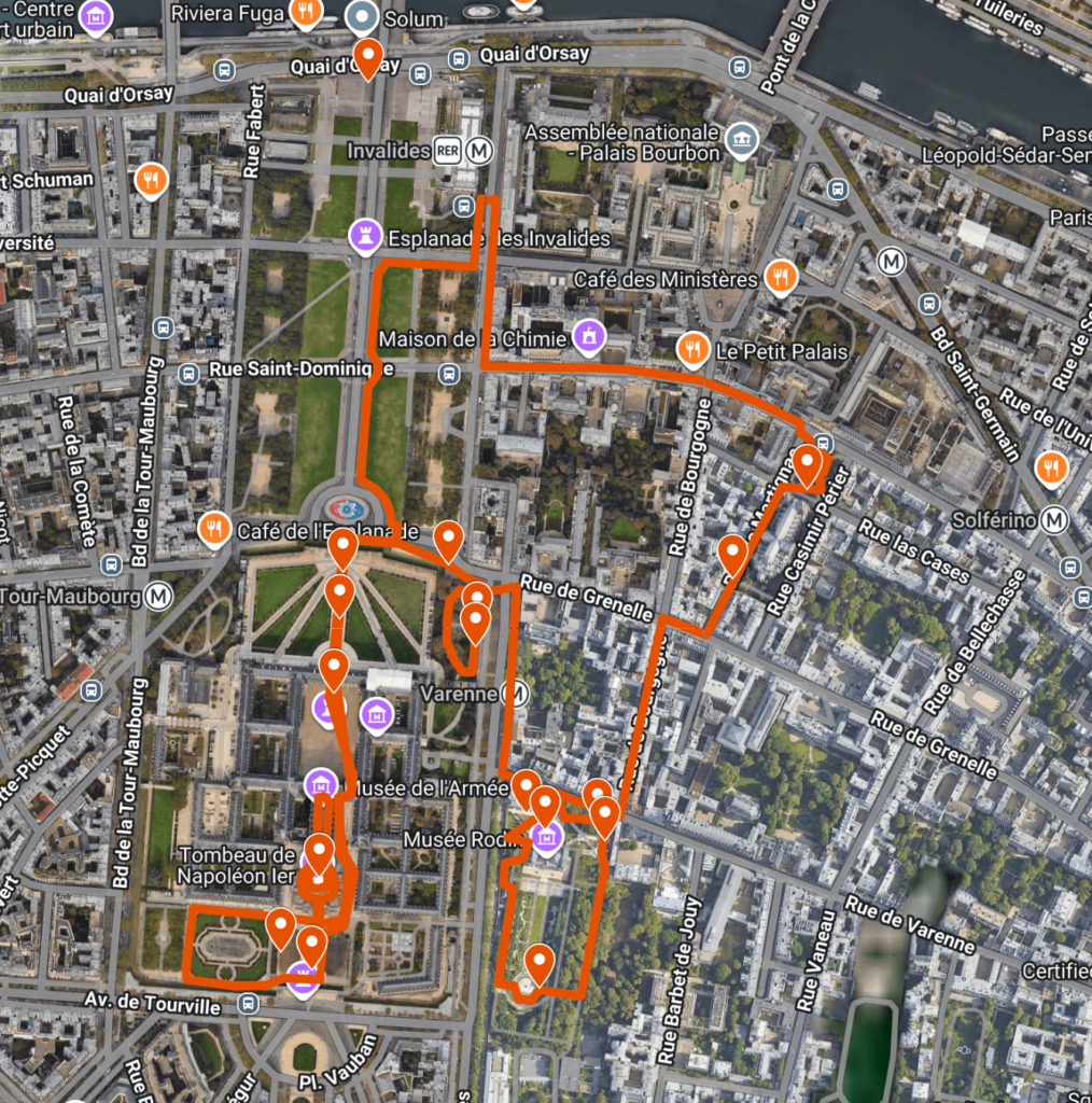 Vad du får se: Esplanade des Invalides, Hôtel des Invalides, Mansarts staty, Cathédrale Saint-Louis-des-Invalides, Napoleons grav, en super-fotospot, Musée Rodin med trädgård, en väldigt förbisedd nygotisk basilika