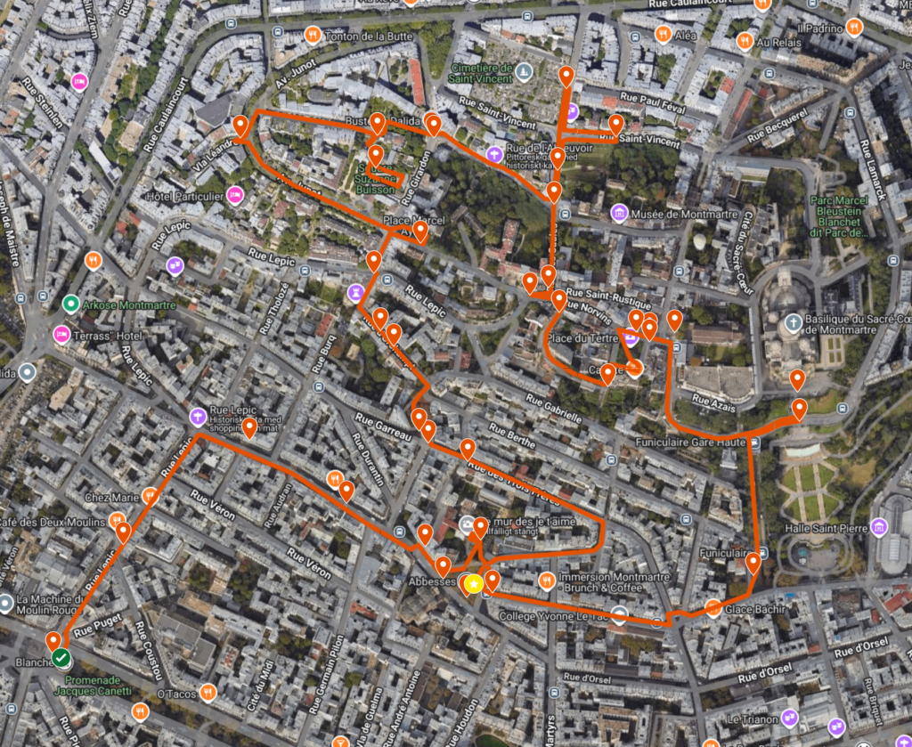 Vad du får se: Moulin Rouge, Amélies café, Rue Lepic, Rue des Abbesses, gubbe som tittar ut, Place des Abbesses, Art Noveu-kyrka, vägg med kärleksbudskap, trappor upp till Sacré-Cœur, Sacré-Cœur, Place du Tertre, målad fasad, Sacré-Cœur från olika platser, La Maison Rose, vingård, Lapin Agile, Rue de l’Abreuvoir, Dalidas byst, idyllisk trappa, huvudlöst helgon, Villa Léandre, flyende gubbe, känd kvarn, fina hus, Amélies affär