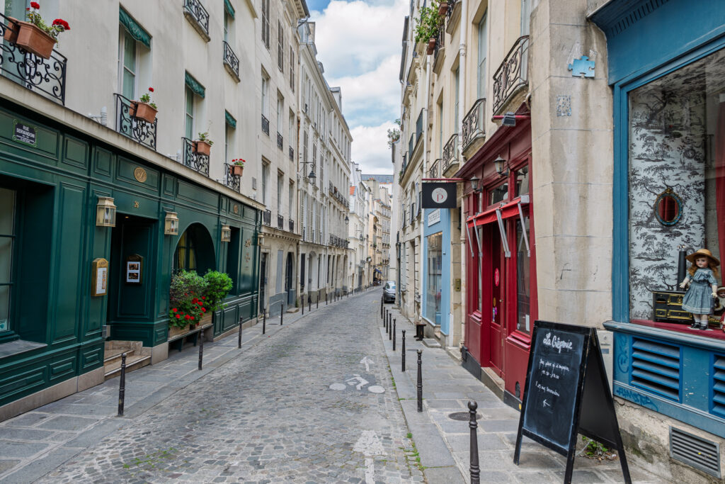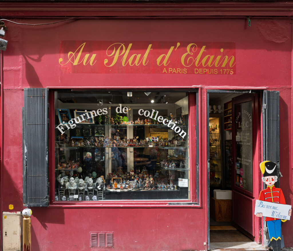Fortsätt österut längs kyrkans norra vägg. Notera gärna den väldigt eleganta skylten ovanför porten till 36 Rue Saint-Sulpice. Sådana här påkostade nummerskyltar var ett vanligt sätt att göra diskret reklam för bordellen bakom portarna. I detta sammanhang kan påpekas att bordeller är förbjudna sedan 1946. Sväng vänster in på Rue Mabillon och promenera ett kvarter innan du svänger vänster igen in på Rue Guisard. Mot slutet av denna lilla gata hittar du på höger sida Au Plat d’Etain. Det är en fullständigt underbar liten butik fylld med modeller i tenn – tennsoldater, cyklister och politiker, bara för att nämna en bråkdel.