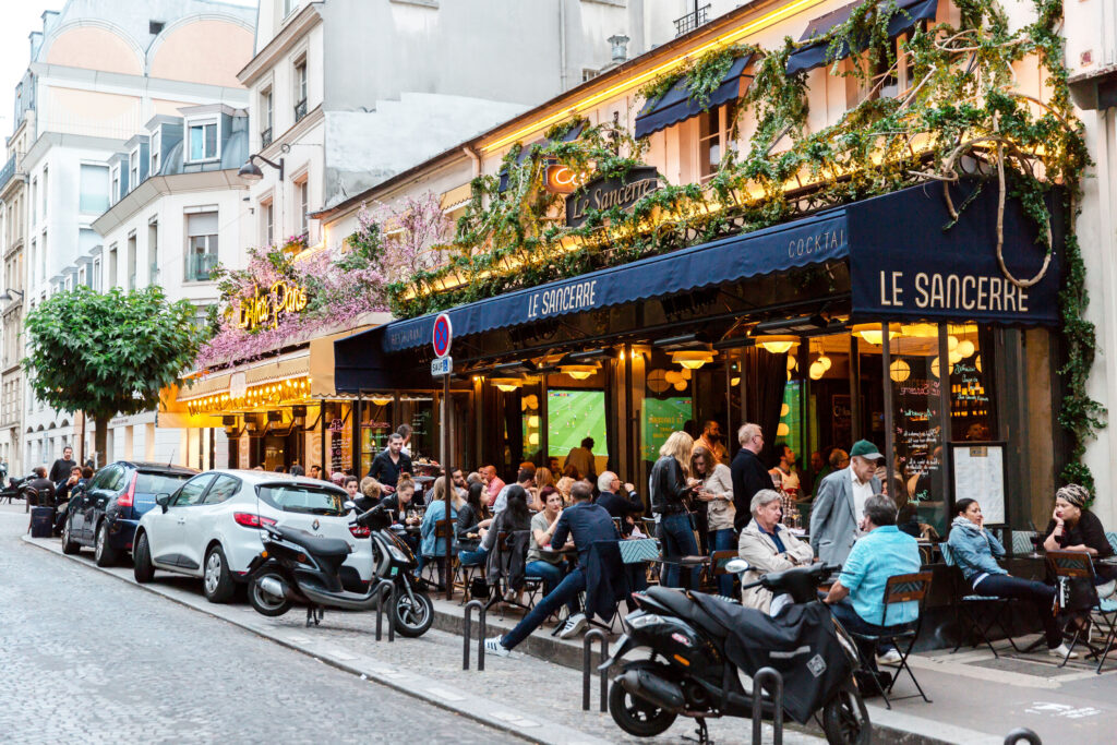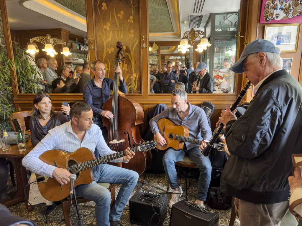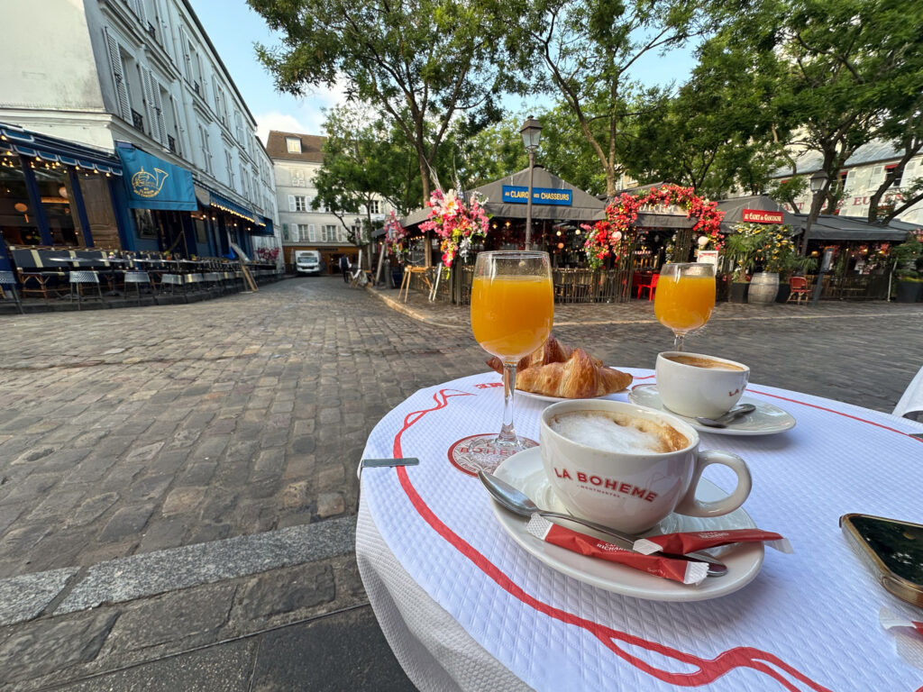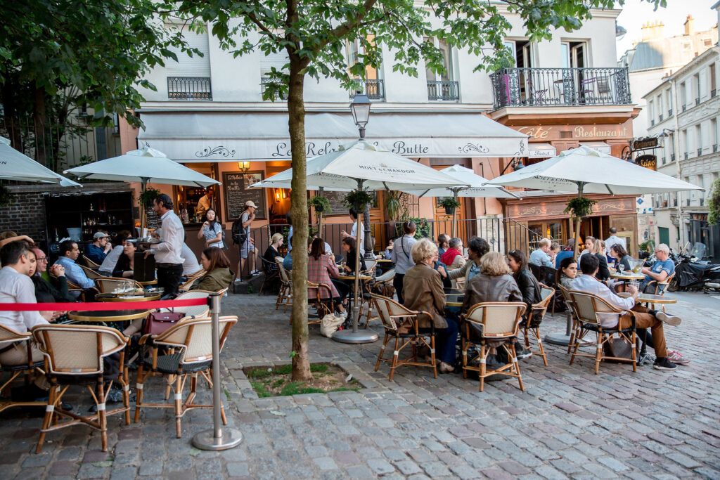 Place du Tertre är verkligen ett fint litet torg, men utgör också (tillsammans med området framför Sacré-Cœur) något av ett epicentrum för turistträngsel i Paris. Att ta sig fram här kan dagtid ställa vissa krav på målmedvetenhet. Att sitta på någon av trottoarserveringarna och njuta lämplig dryck kan vara trevligt, men söker du fast föda, står mer prisvärd sådan att finna annorstädes.