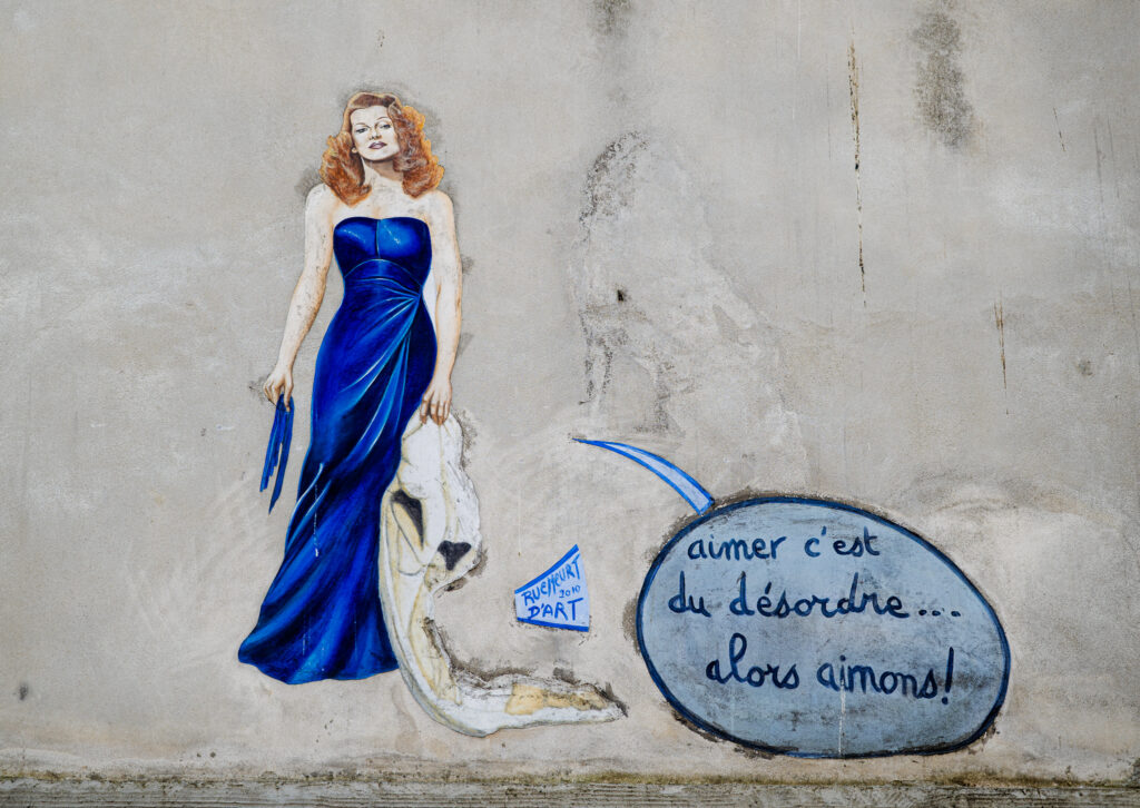 Du är nu framme vid Place des Abbesses. Om du viker vänster på torget kan du fortsätta upp till Le mur des je t’aime; en blå keramikvägg med frasen Jag älskar dig, på 250 olika språk. Det är en populär turistmagnet, men det finns tider på dygnet den lilla parken kan erbjuda en stunds kontemplation över budskapet i detta verk av Frédéric Baron och Claire Kito. Men, som filmnörd road av Street Art, kan jag inte låta bli att fotografera Gilda som pryder väggen ovanför konstverket.