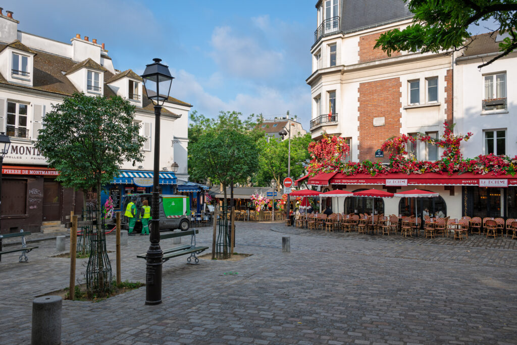Vänd tillbaka samma väg du kom, passera trapporna och fortsätt Rue Saint-Éleuthère. Stannar du till där vägen kröker höger, kan du fånga en utsikt över Eiffeltornet i fjärran. Fortsätt sedan till Place Jean Marais där du – samma tidiga morgon – kan skåda in mot det lika idylliska Place du Tertre.