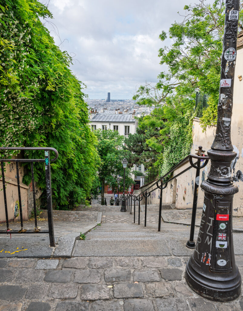 Gatan går över i Rue Tardieu som leder till Place Suzanne Valadon. Där möter du denna långa trappa. Du har nu att klättra uppför denna, alternativt nyttja den intilliggande Funiculairen, bergbanan som går samma sträcka och där man betalar med en metrobiljett (vilket så här långt, i detta liv, alltid varit mitt prefererade alternativ).