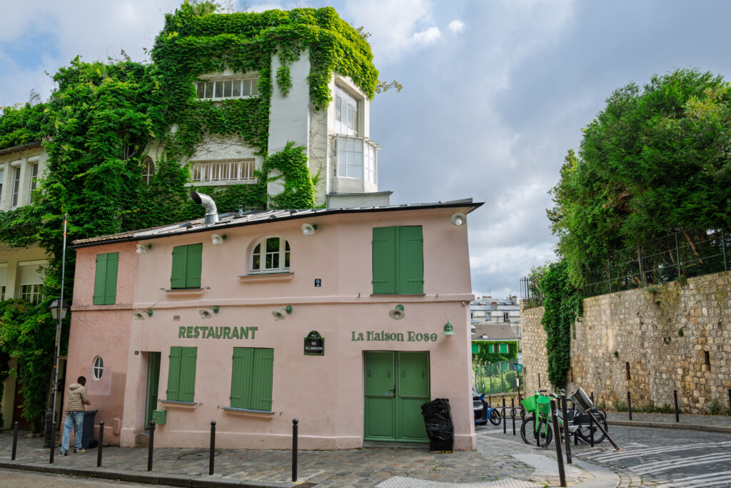 I den första korsningen kommer nästa, från instagram kända motiv. Restaurant La Maison Rose. Här har jag aldrig ätit och har alltså inget omdöme att ge. Vi fortsätter framåt på Rue des Saules.