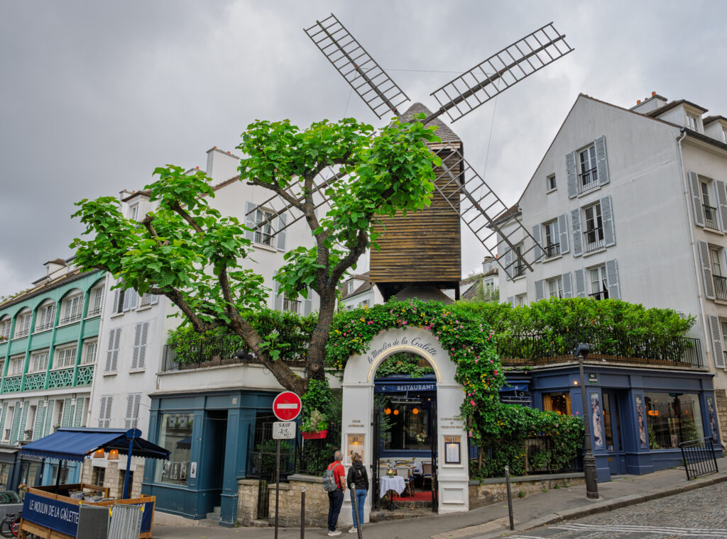 Montmartre hade en gång i tiden många väderkvarnar. En som står kvar utgör ett tydligt riktmärke för en stadsdelens restauranger. Rue Girardon tar slut i den här korsningen, men på andra sidan vidtar Rue d’Orchampt.