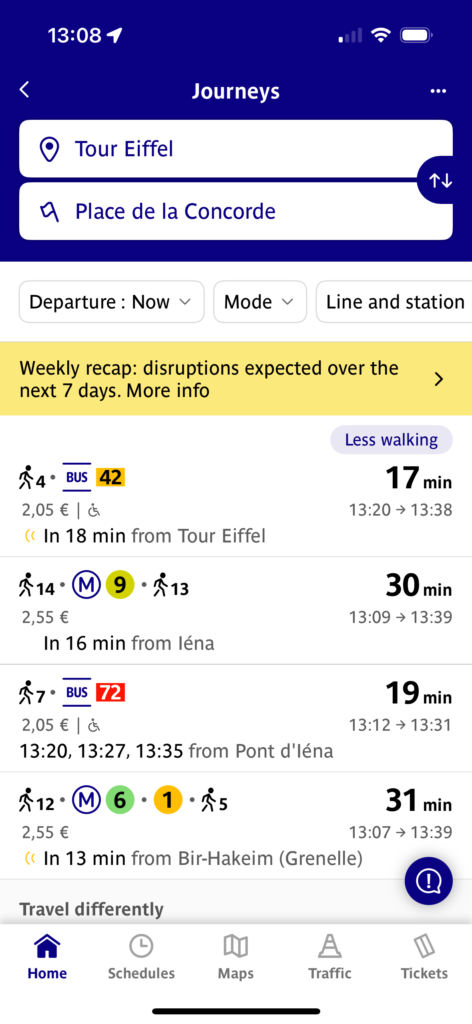Tittar man på en karta över Metronätet så ser det rörigt ut. Den enkla lösningen är att ladda ner appen ”Bonjour RATP”, där du bara skriver in vart du ska (och eventuellt varifrån du åker. Du får då en lista över de olika transportmöjligheter som står till buds. Vilken linje varifrån, byte till vad och var, tider samt med ett litet klick på skärmen en karta som visar vilken väg du ska gå till din slutdestination. Om du inte ska resa precis nu, kan du ange när du vill åka, eller när du måste vara framme.