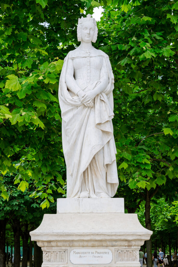 På statyns sockel står det 1219-1295, men Marguerites födelseår anges i de flesta källor som runt 1221. Hon var äldst i syskonskaran, fyra systrar som alla blev drottningar. Pappa Raimond-Bérenger IV, hertigen av Provence, fick alltså en jackpot i döttrarnas äktenskapsförhandlingar; åtminstone vad status anbelangar. Mamma Béatrice de Savoie hade själv gott anseende som diplomat och sågs som en duglig härskare. Döttrarna fick sedermera snarlika eftermälen, men förutom en uppenbarligen adekvat undervisning, vet jag inte mycket mer om Marguerites tidiga år. Hon blev redan tidigt beryktad för sin skönhet, så när den franska regenten, änkedrottning Blance (läs mer om Blanche) började söka en drottning till sonen Louis IX, föll siktet på den unga Marguerite. Hennes djupa fromhet, snarare än skönheten, blev det som fällde avgörandet. Marguerite och Louis gifte sig 1234. Relationen till svärmor blev minst sagt ansträngd, vilket kan läsas om i avsnittet om Blanche. Trots att Blanche i sin svartsjuka gjorde allt hon kunde för att hålla paret åtskils dagtid, verkar äktenskapet ha varit präglat av en äkta tillgivenhet mellan makarna. Marguerite hade dock vissa problem att den asketiske Louis inte klädde sig med den prakt som anstod en kung. Men hursomhelst, paret lyckades producera elva barn, varav endast två avled i ung ålder. Den näst äldste sonen blev kung under namnet Philippe III (även känd som Filip den Skallige). Den yngste sonen Robert blev stamfader för den sidogren som senare ledde till kungarna av Bourbon.
