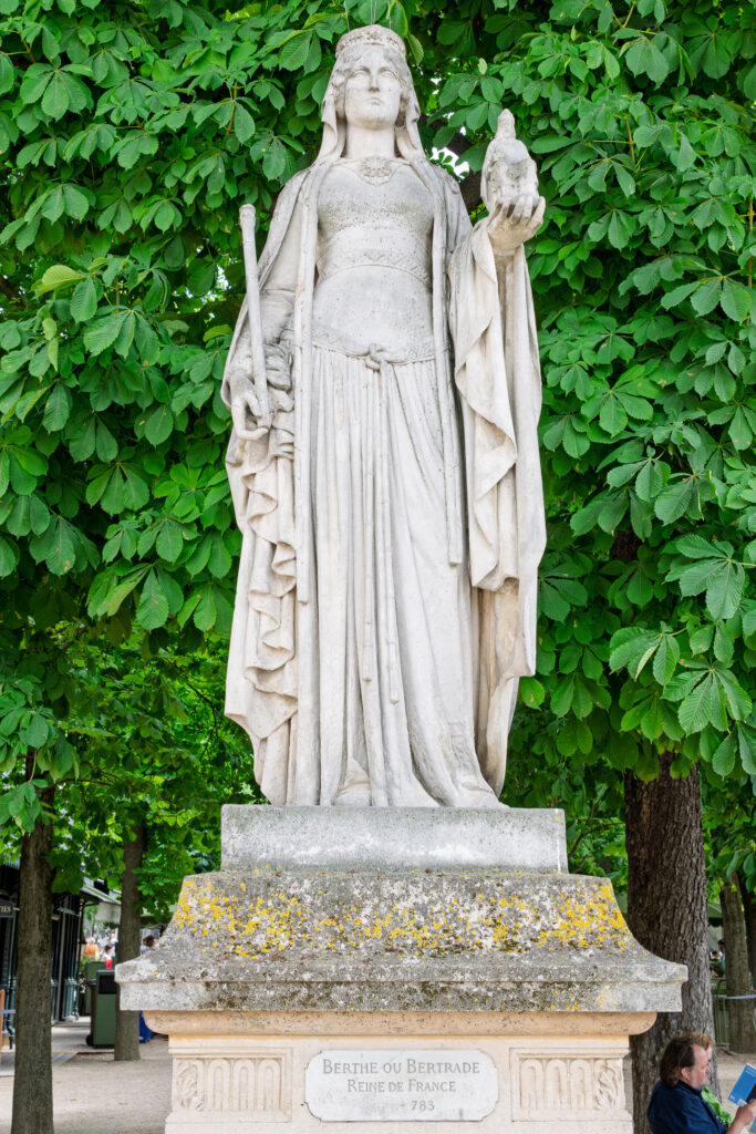 Bertrade föddes någon gång mellan 710 och 727. Någon gång nära 740 gifte hon sig med Pépin le Bref (Pippin den lille), som då var Maire du palais i Neustrien, Burgund och Provence. Möjligen är det honom Bertrade håller stadigt i sin vänstra hand. Bertrade var Pépins kusinbarn, så egentligen var de för nära släkt för att enligt tiden bestämmelser få gifta sig. Ställda inför fait accompli, fick de dock kyrkans välsignelse när deras första barn, den blivande Charlemagne, hade fötts. Här finns det anledning att påbörja en parentes.