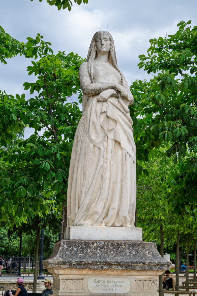 Clovis I var ett hängivet fan till Geneviève. Han lät, på hennes uppmaning, anlägga ett kloster intill den plats där Pantheon ligger idag. Klosterkyrkan kom snart att döpas efter Geneviève, och var den första kyrka att hysa hennes kvarlevor. Den byggdes om några gånger men revs slutligen för att ge plats åt Pantheon. Det enda som återstår idag är det torn, Tour de Clovis, man kan se inbakat i Lycée Henri-IV bakom Pantheon. Tornet är betydligt senare än den ursprungliga klosterkyrkan, för vilket vi har våra förfäder vikingarna att tacka. Vikingarna brukade passa på att bränna ner det mesta när de ändå härjade i Paris (vilket man ju kan försöka ha i perspektiv när man beklagar sig över dagens turistinvasioner). I sammanhanget kan också nämnas att Geneviève aktivt bistod Clotilde, Clovis hustru, i dennas försök att övertala maken att döpa sig. Mer om detta senare, när vi kommer fram till Clotildes staty…