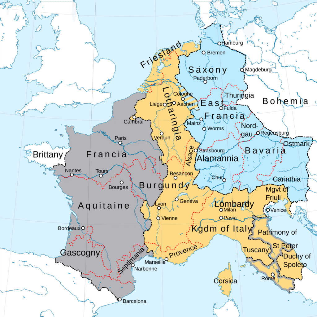 Enligt god frankisk sed vidtog nu ett Game of Thronande. Inbördeskrigen avlöste varandra, slutligen kom kejsardömet att delas upp i tre kungadömen med Louis tre äldsta söner som kungar, men fortfarande underlydande kejsaren. Det Västfrankiska riket utvecklades senare till dagens Frankrike, den östra delen blev senare Tyskland och det i mitten blev Italien – i stort sett. Den förste västfrankiske kungen Charles II (Charles le Chauve, Karl den skallige) och hans bröder började snart konspirera mot varandra, Charles hann med att vara kejsare ett par år före sin död 877.